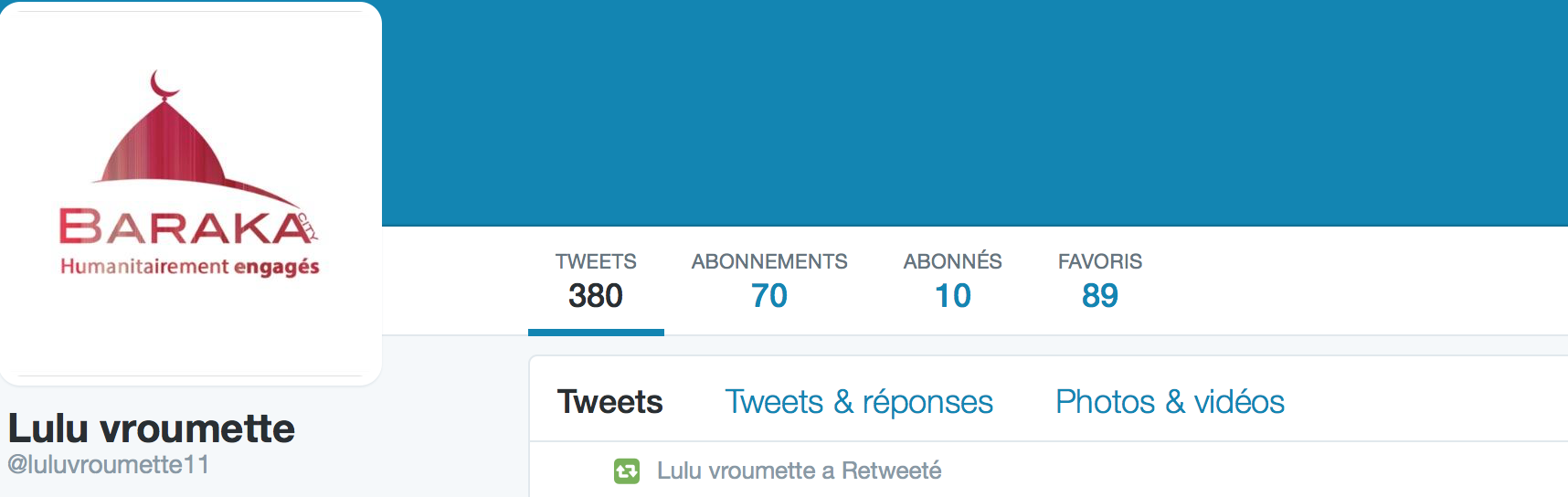 Questo ha ottenuto una 60na di retweets. Tuttavia, controlliamo a fondo gli account che stanno dietro questi retweet, scopriamo qualcosa di singolare: sono account falsi. Sono account creati solo per alimentare artificialmente il numero di RT, come MannWhatsup, che postano ossessivamente materiale a senso unico, creati solo per gridare allo scandalo. La maggior parte hanno questa caratteristica, sono account “vuoti” che twittano e retwittano a comando e alle spalle non hanno una persona fisica. Nicolas conosce molto bene l’account dell’associazione umanitaria Baraka City, coinvolto in altre iniziative: